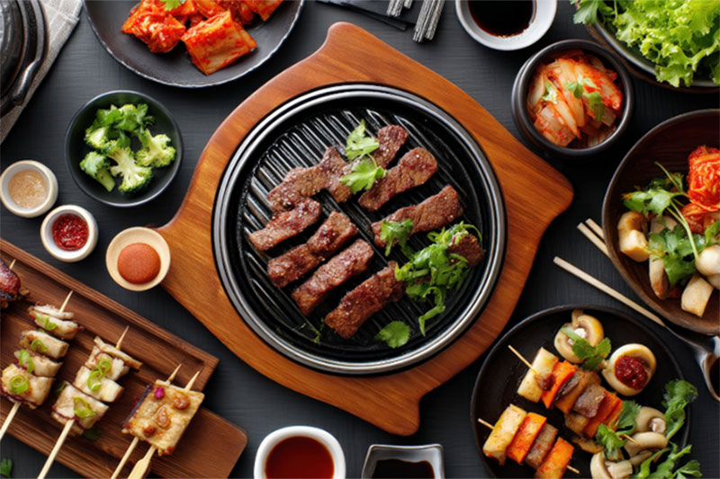 韓國豬肉以油脂分布均勻、肉質鮮嫩著稱,是韓式烤肉的靈魂。五花肉酥香、梅花肉柔嫩、豬頸肉Q彈有勁。厚切五花肉高溫烤後外酥內嫩,搭配生菜、泡菜、蒜片與醬料包食,清爽又多層次。圍坐烤盤旁親手烤肉、分享食物,不僅滿足味覺,也凝聚情感,成為韓式文化中最具代表性的美食體驗。