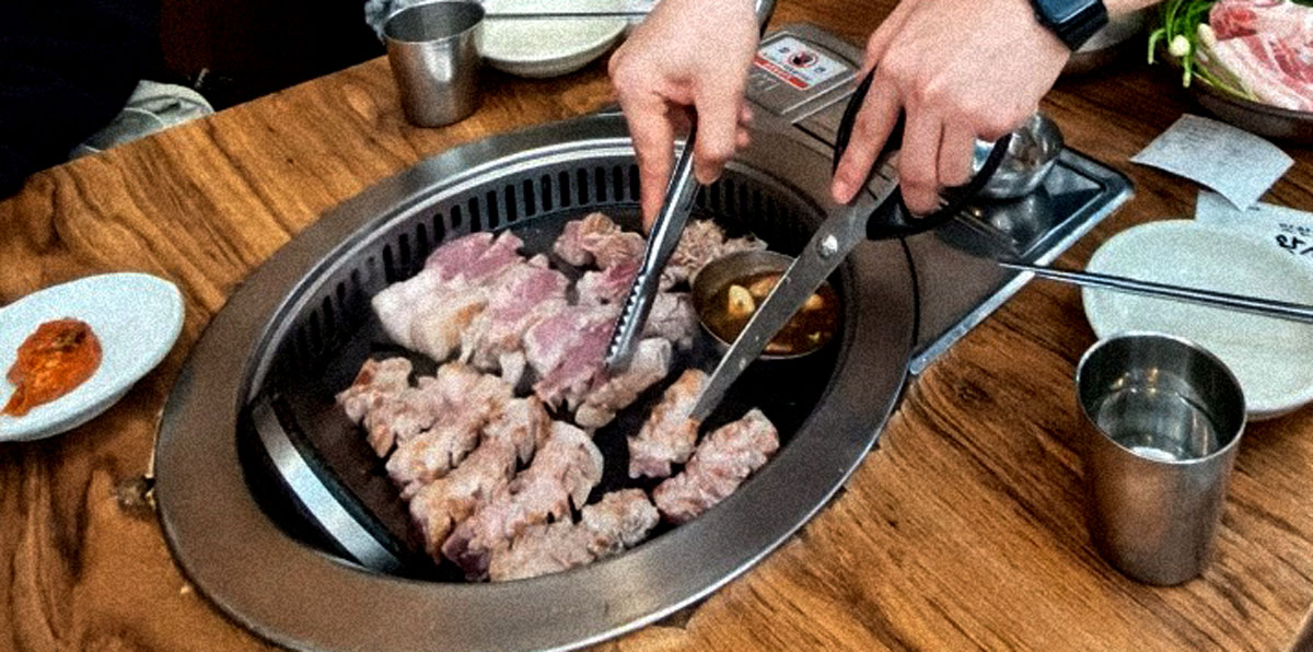 說明: 韓國豬肉以其油脂分布均勻、肉質鮮嫩聞名,是韓式烤肉的靈魂,常見部位如五花肉、梅花肉、與豬頸肉為主,各具特色。五花肉肥瘦交錯,烤後酥香四溢,是經典首選;梅花肉油花細緻、口感柔嫩;豬頸肉則Q彈有勁,可以吃到脆的口感,五花肉厚度從1公分至3.5公分厚切都有,能在高溫下形成酥脆表皮,同時保留肉汁,烤好韓式豬肉,搭配生菜、泡菜、韭菜、蒜片、與醬料一同食用,不僅去膩,也增添層次,這樣包再一起後大口放入嘴裡咀嚼享用,是正統韓式吃法,也讓烤肉成為多重風味的味覺饗宴,韓式烤肉不僅是味覺享受,更是社交場合的催化劑。圍坐在烤盤旁,親手烤肉、分享食物,營造出溫馨的用餐氛圍。